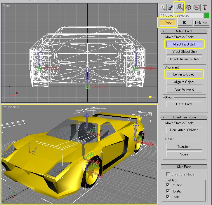 All objects in the scene have a point at which they rotate upon. This is the pivot point. Generally the pivot is placed 'center to the object'. This is important for the wheels so that they rotate and turn about their centre.